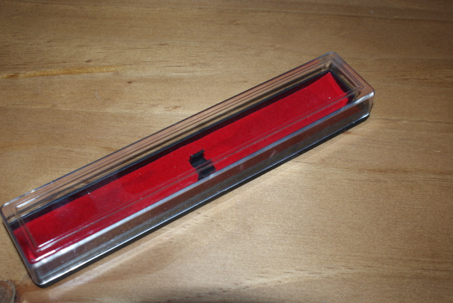 Clear plastic box to hold one pen.